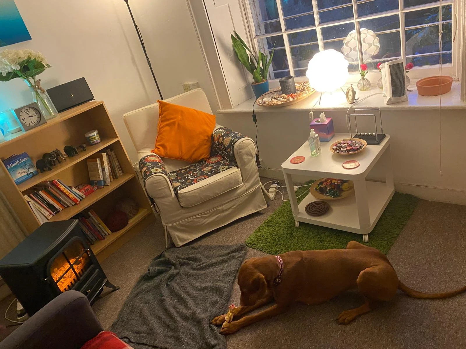 If you think it would be helpful, therapy dog Poppy can join us by prior arrangement, provided it’s a good fit.